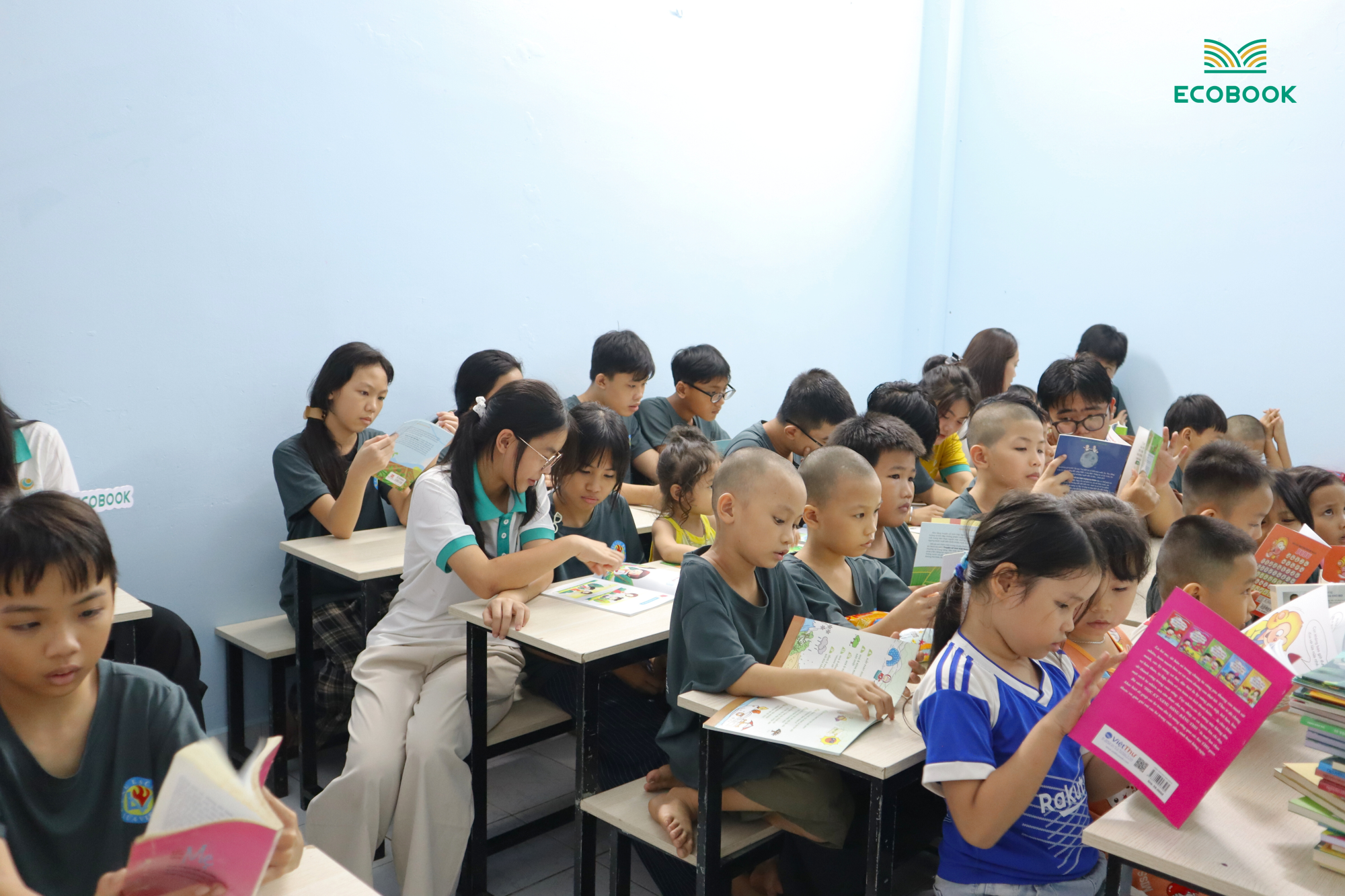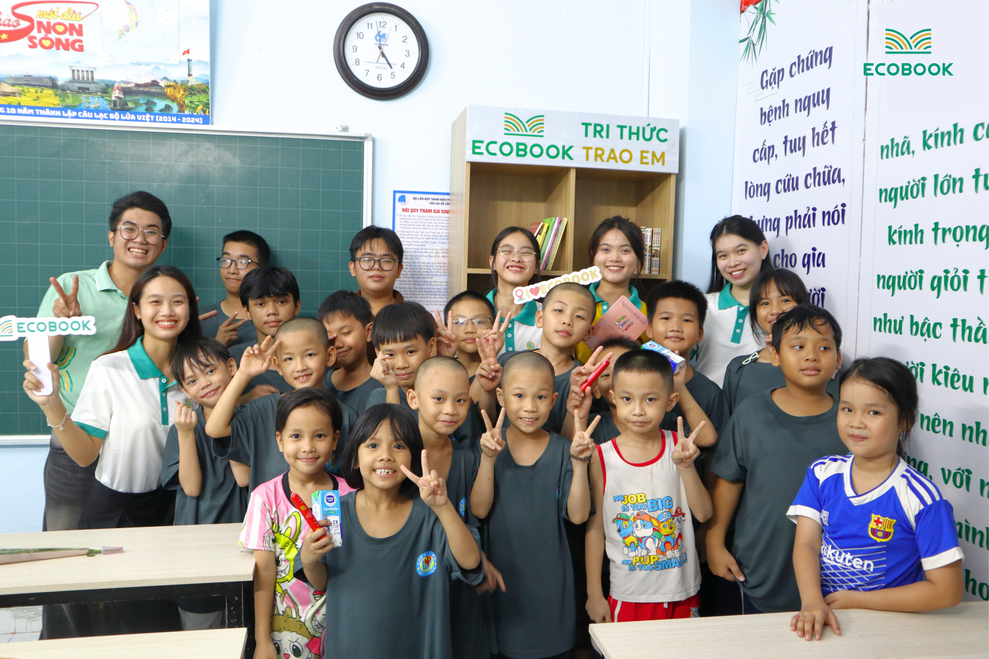 Tiếp nối sứ mệnh “Tri thức mở hạnh phúc”, cũng trong dịp này, chúng tôi đã gửi tặng lớp học kệ sách “Tri thức trao Em” với hơn 100 tựa sách và tập vở mới. ECOBOOK hy vọng, mỗi quyển sách là bài học quý giúp các em tiếp cận kiến thức mới, bởi vì, học sinh đọc sách để làm giàu tư duy và tri thức sẽ “nở hoa”.